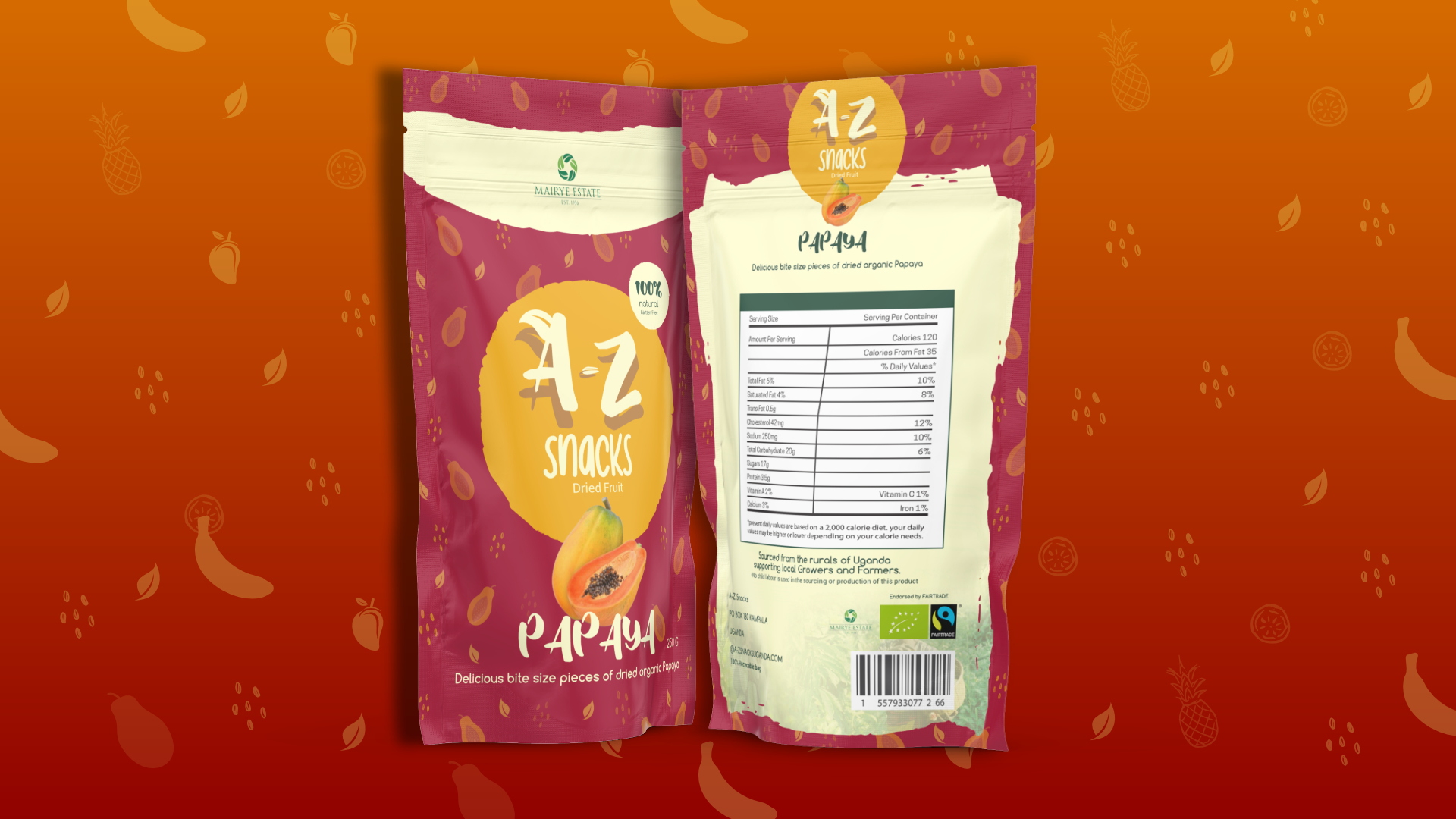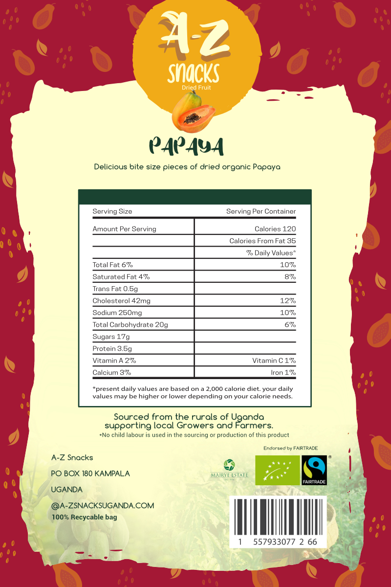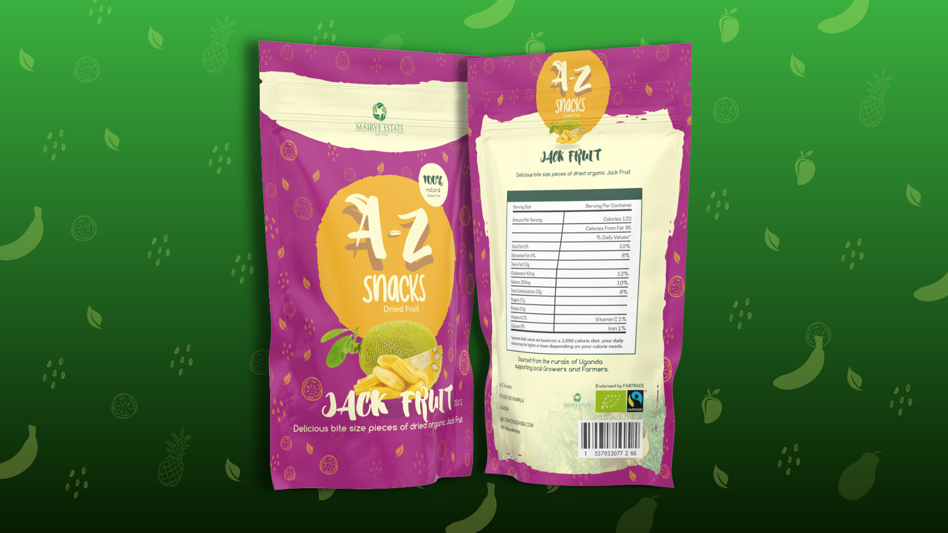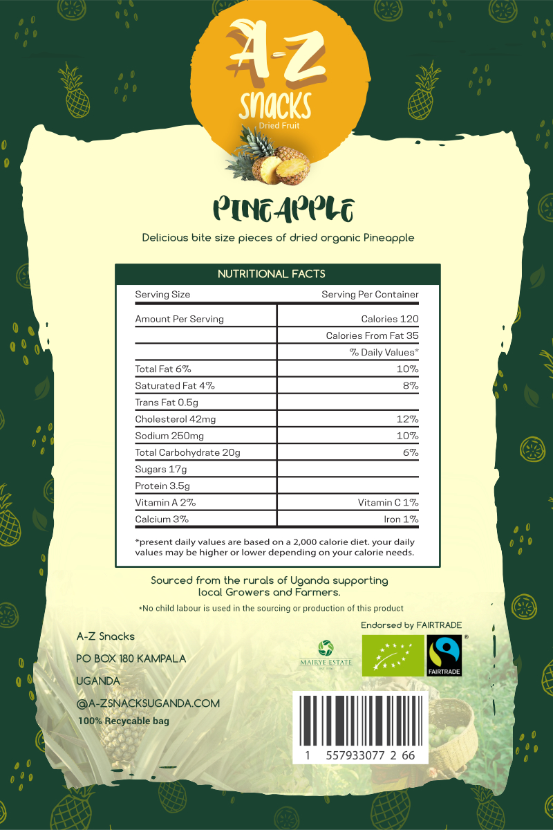Brief: A-Z Snacks, a newly established dried fruit snack brand, featuring produce from Fair Trade Farmers and growers in Uganda was needing a colourfully distinct packaging design.