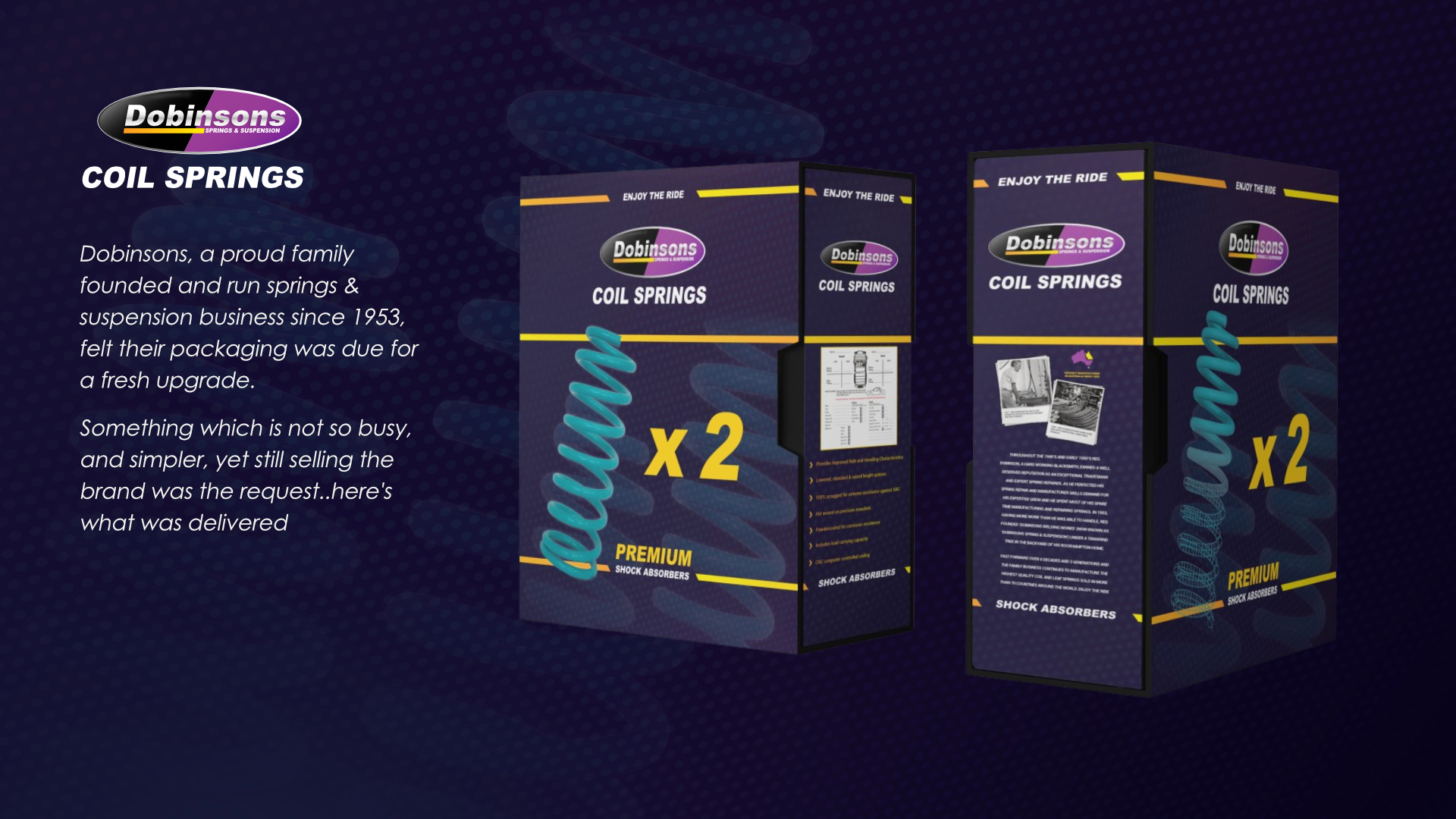 Brief: Dobinsons, a proud Australian family founded and run business of springs & suspension since 1953, felt their packaging was due for a fresh upgrade.