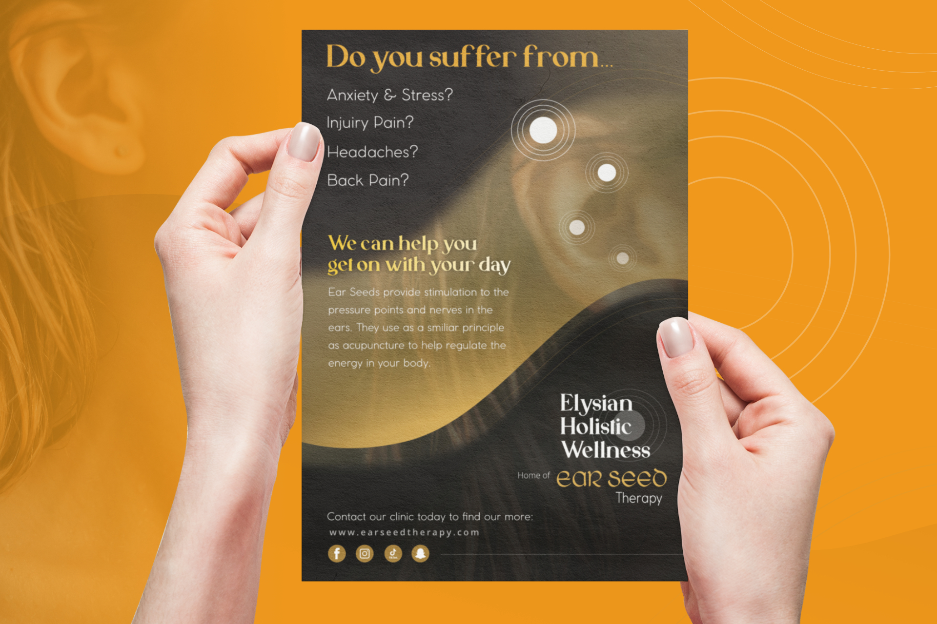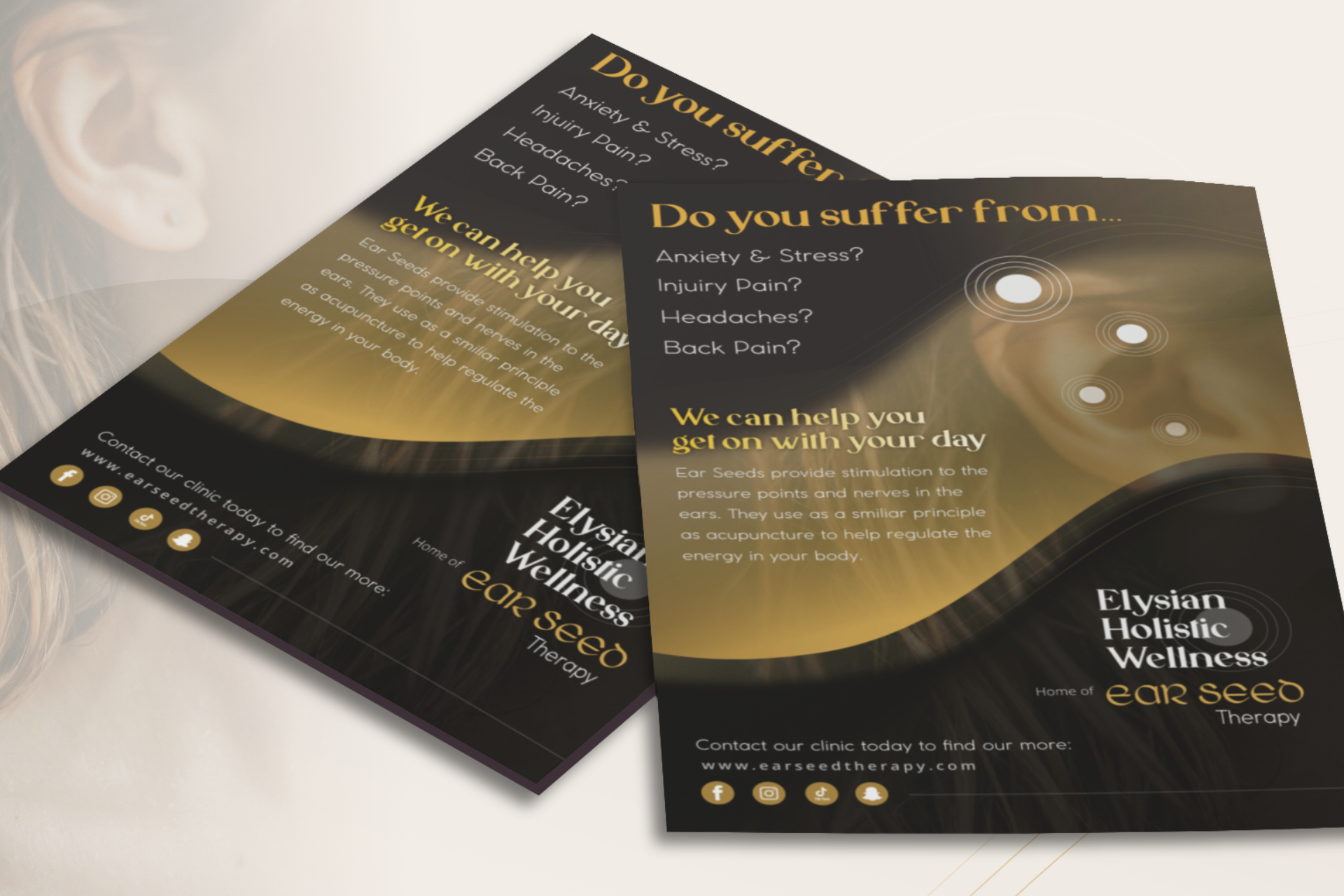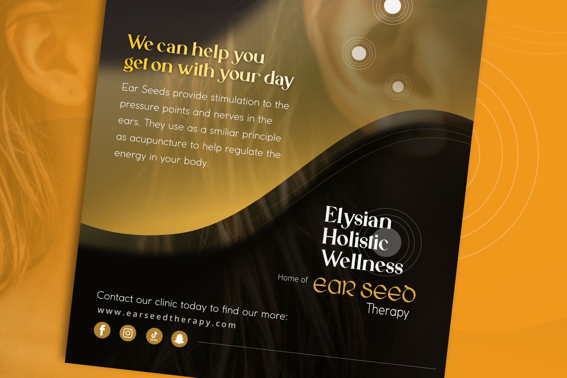 Brief: A health and wellness practice by the name of Elysian Holistic Wellness based in Northern Ireland requested a logo red-design, as well as new leaflet design to go with their Earseed therapy service.