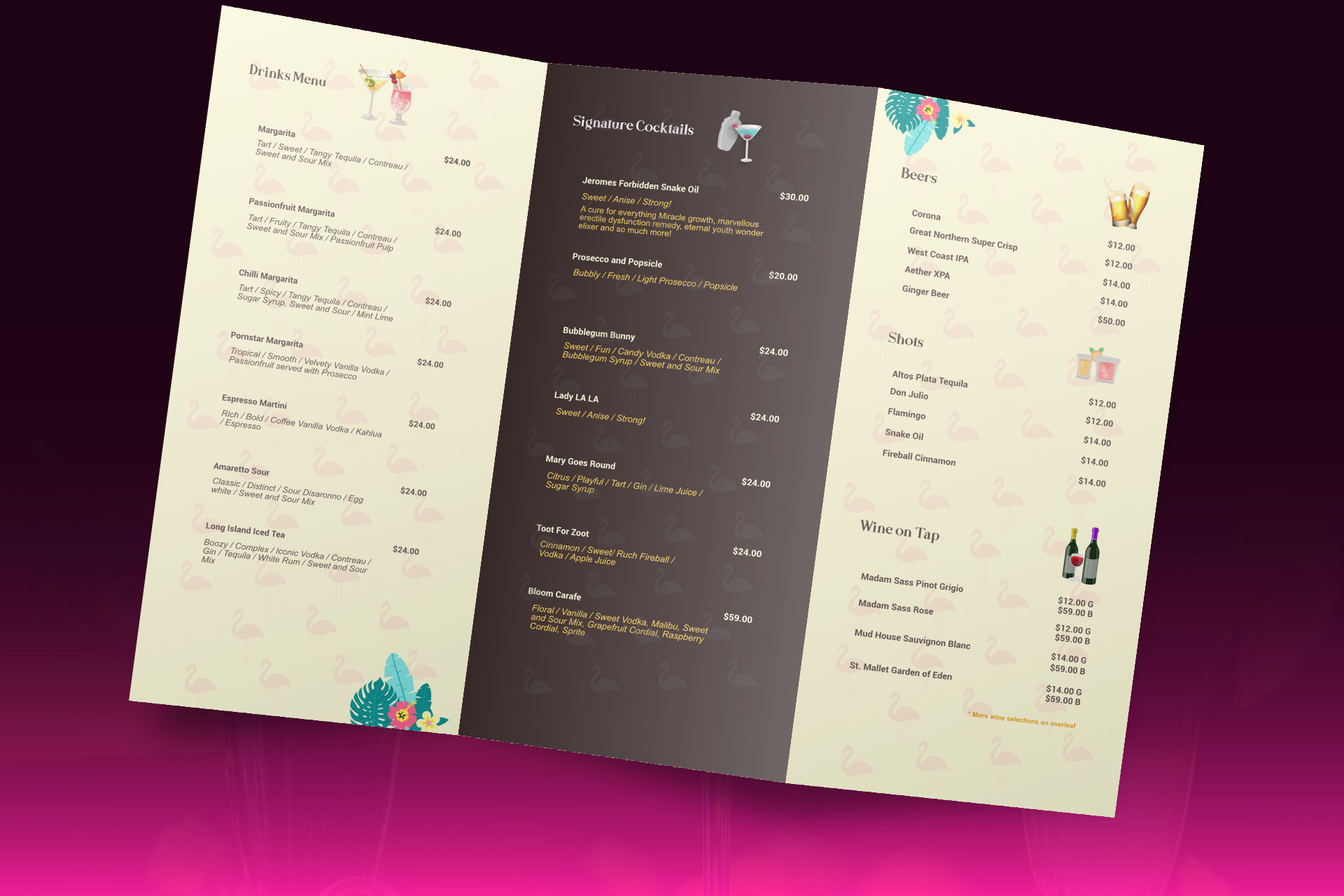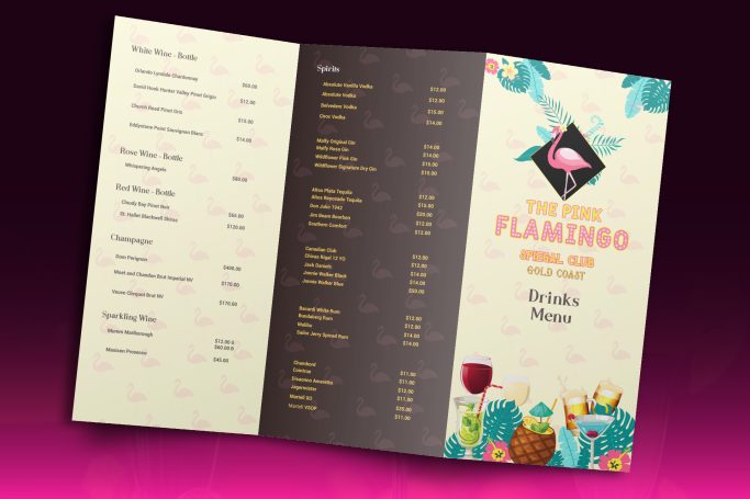 Brief: The Pink Flamigo Spiegal Club of Australia's Gold Coast needed a new and improved Drinks menu in the opening of their newly revamped residence bar.