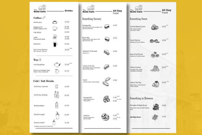 A logo as well as use of fonts, colour scheme and other elements were used to capture the personality of the business and present a successful drinks menu design for customers to enjoy.