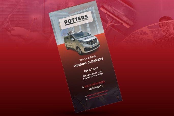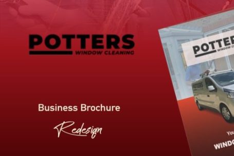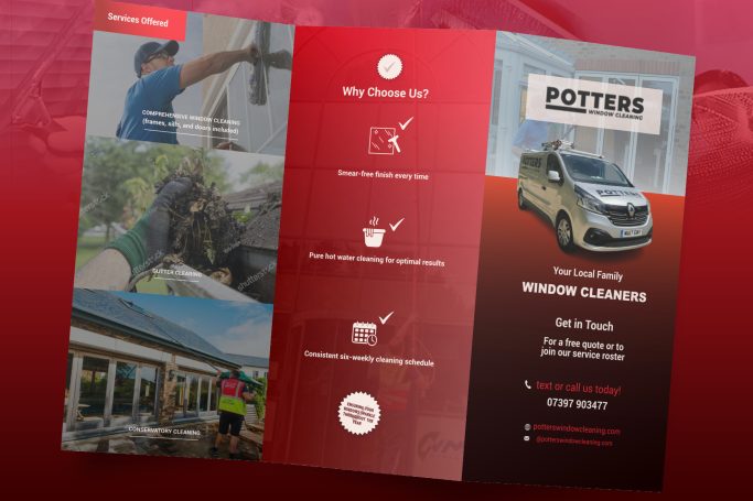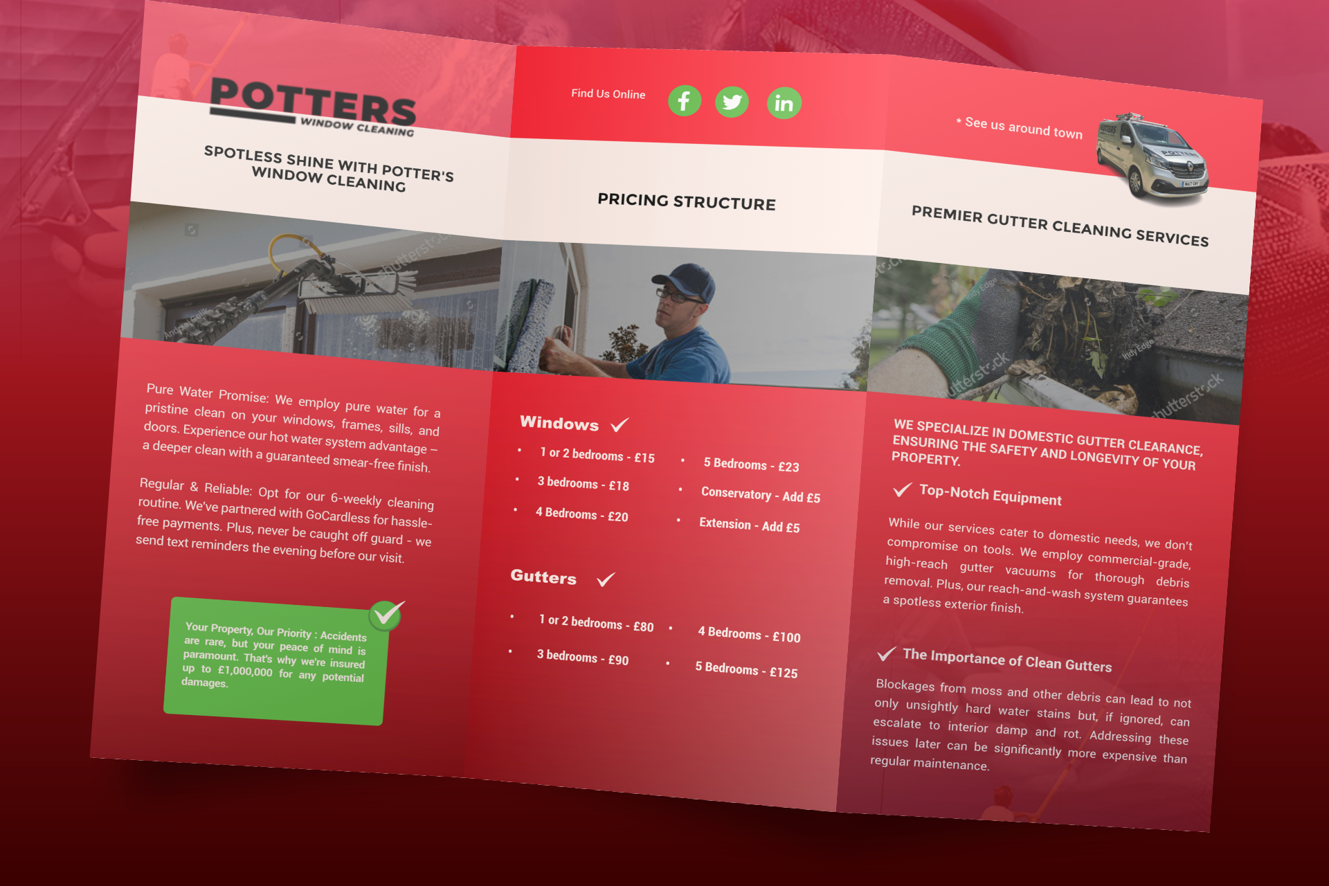 Brief: Potters Window Cleaning, a UK based family founded and run window cleaning service were in need of a fresh business brochure to feature their updated and extended services while advertising their contact details and locality.